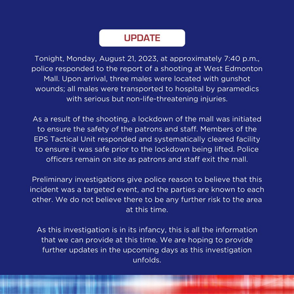 警方對晚上 7 點 40 分左右發生槍擊事件的報警做出了回應,購物者和商場員工被告知躲到商店和餐館後面避難。警方呼吁行人和司機遠離西埃德蒙頓購物中心和附近地區,並表示該購物中心當時被封鎖。
