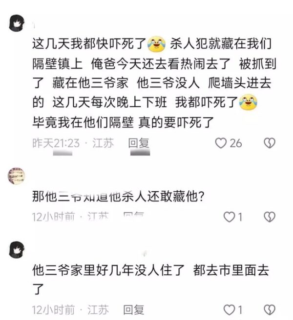 中國大陸近期恐怖凶殺不斷。江蘇宿遷壹名男性村民連殺叁人,網傳是他的女友壹家人。