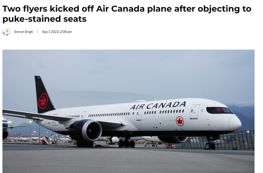 (加西網綜合)加拿大航空近日多次被曝出問題,近日有兩名女性乘客因抱怨座位區有嘔吐物污漬和惡臭,而被機長強制要求離開飛機。