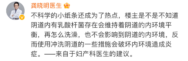中國婦產科網創始人、婦產科醫生龔曉明提出,健康成人的私處菌群有維持環境平衡的功能,只要不進行內部沖洗,再怎麼洗澡都不會導致婦科炎症。