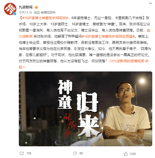 28歲的中國青年張炘炀16歲就讀博士,曾被譽為“神童”,後來花了8年才拿到博士學位。如今他沒有固定工作,銀行卡只剩人民幣幾千元,父母不時匯錢接濟。但張炘鞆巾嵞[春藶猓蛭安揮每幢鶉說牧成薄