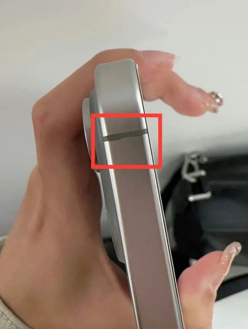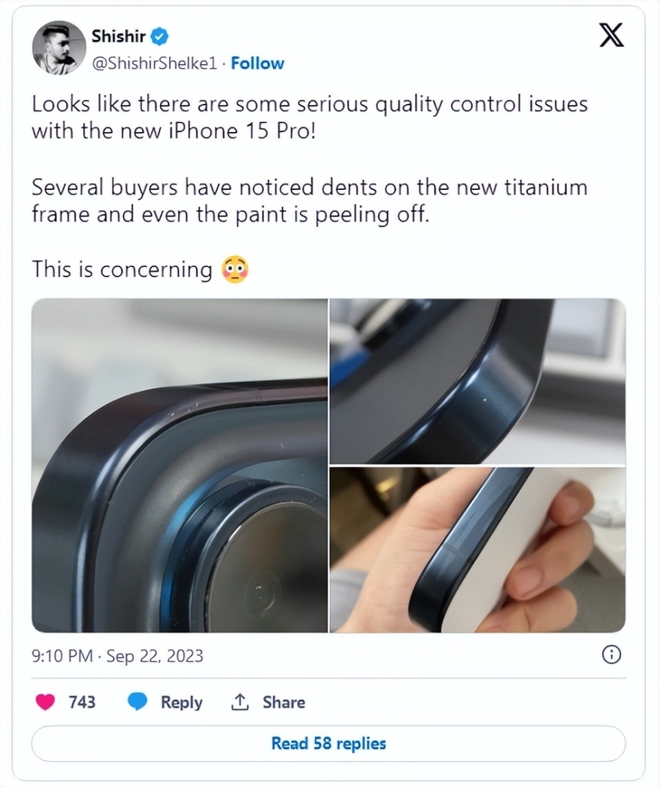 該博主表示:iPhone 15 Pro 存在壹些嚴重的質量控制問題!新鈦合金中框上有凹痕,甚至油漆脫落的現象。