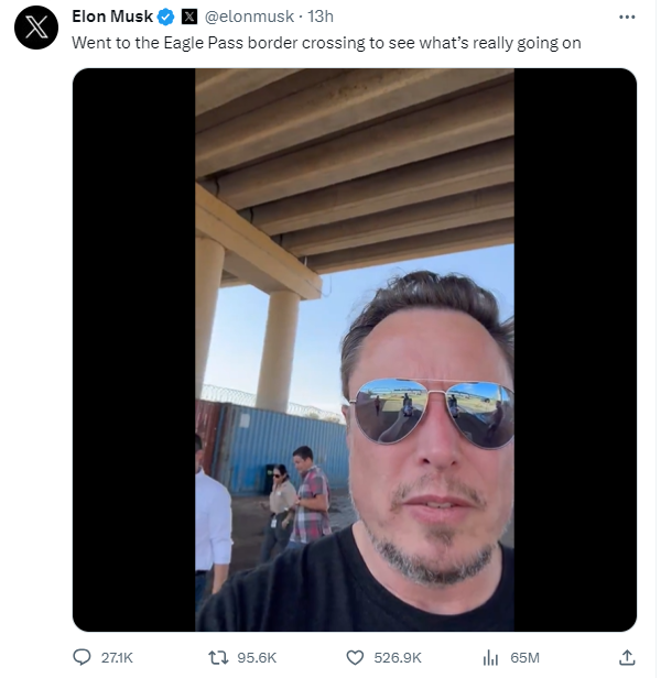 在X上發布的4分鍾視頻片段中,馬斯克介紹了得州共和黨國會眾議員岡薩雷斯(Tony Gonzales),後者對馬斯克表示歡迎,並稱得州邊境居民“真的感覺被拋棄了”。