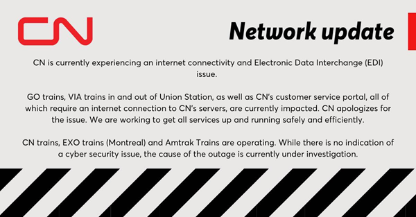 CN 在一份声明中表示:“进出联合车站的 GO 火车、VIA 火车以及 CN 的客户服务门户目前都受到影响,所有这些都需要通过互联网连接到 CN 的服务器” ,“CN 对此问题表示歉意。我们正在努力让所有服务安全高效地启动和运行”。