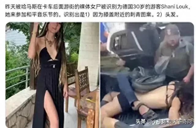 有壹名參加音樂節的德國籍女子疑似被殺後遭到裸體游街示眾。全世界都看到了那可恥的壹幕。但是,有人在歡呼,有人在點贊。該德國女子名叫沙尼·洛克,30歲,她的家人通過她的發型和紋身認出了她。她不是以色列士兵。事後,“哈馬斯”的解釋是:“誤以為她是士兵”。這個解釋的每壹個字都充滿了恐怖與無恥。