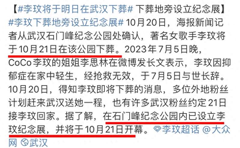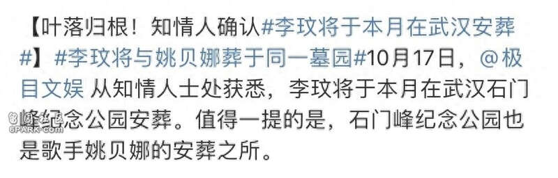 10月20日中午,媒體針對李玟安葬壹事向石門峰紀念公園的工作人員進行確認,從中得知李玟將於21日下葬,時間點正式曝光。