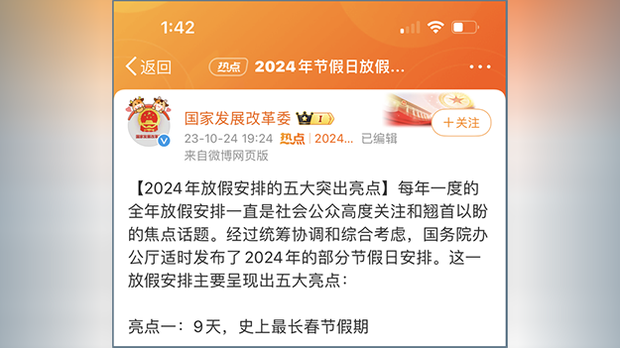 中國發改委官方微博賬號發布的長文,談中國2024年春節放假安排的"伍大亮點"。 微博截圖