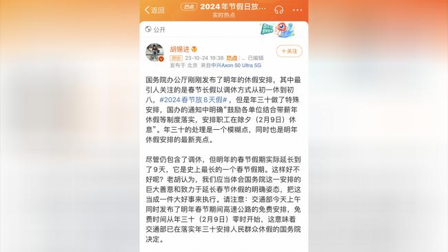 胡錫進就中國2024年春節放假安排的微博長文(微博截圖)