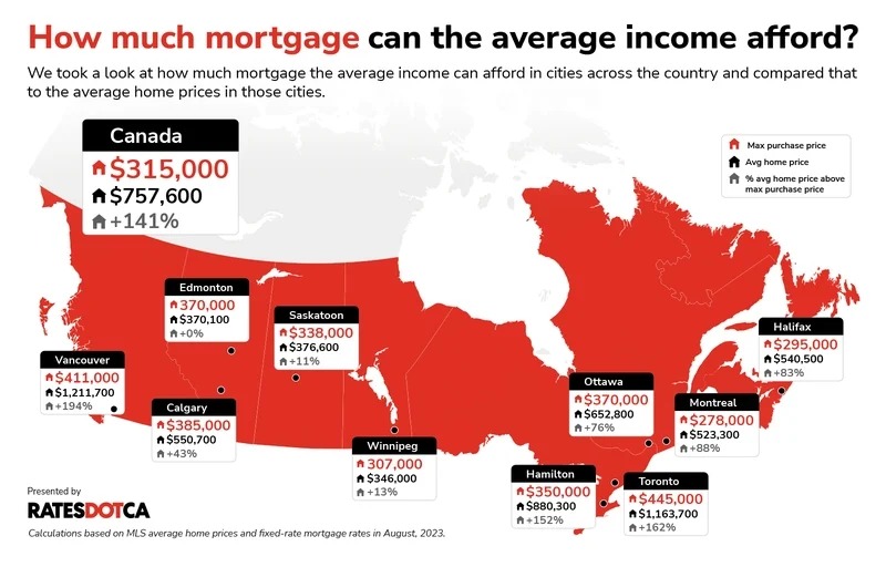 比較網站 rates.ca 采用了主要城市的稅後家庭收入中位數以及收入達到該收入的家庭可以申請的抵押貸款,並將這些數字與這些城市的實際平均房價進行了比較。按照這壹統計,溫哥華的收入與購房成本差距最大。