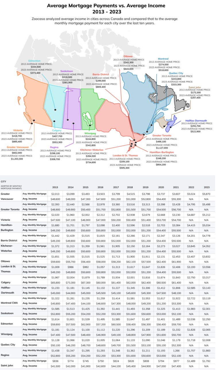 在過去拾年中,每個被分析城市的平均每月抵押貸款付款額都有所增加,大多數城市的抵押貸款付款額增加超過 1,000 加元。自2013年以來,有肆個城市的抵押貸款月供付款額增加超過 3,000 加元。