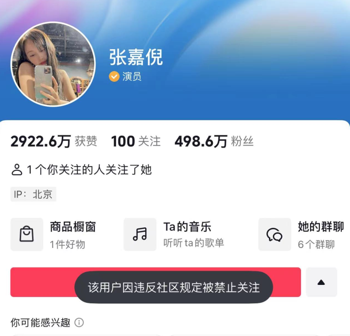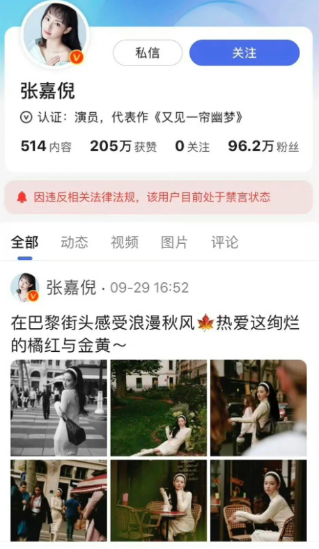 “該用戶因違反社區規定被禁止關注”11月1日,在另壹個社交平台,極目新聞記者發現,演員楊穎與張嘉倪的個人認證賬號已無法點擊關注。