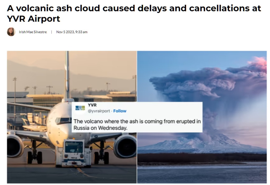(加西網綜合)從極端天氣到員工短缺,溫哥華 YVR 機場出發的航班可能延誤或取消的原因有很多。但現在又出現了壹個新情況:俄羅斯境內的壹座火山打亂了壹些乘客的旅行計劃。