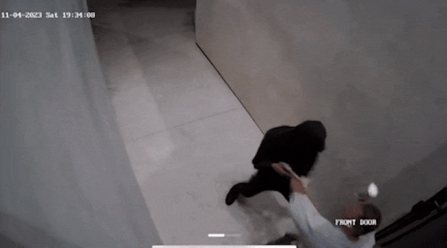 突然间,两名劫匪翻过围墙,其中一名身穿黑色外套的持枪劫匪快步冲到他跟前用枪指着他。