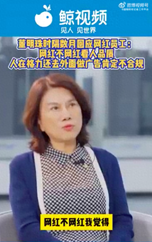 今年5月,董明珠網紅秘書孟羽童離職引發全網熱議,孟羽童稱是准備讀研,董明珠始終未正面回應過此事。11月6日,在接受《財經郎眼》采訪時,被問及網紅員工問題時,董明珠正式做出了回應稱:網紅不網紅看人品質,人在格力去外面做廣告是不合規的。