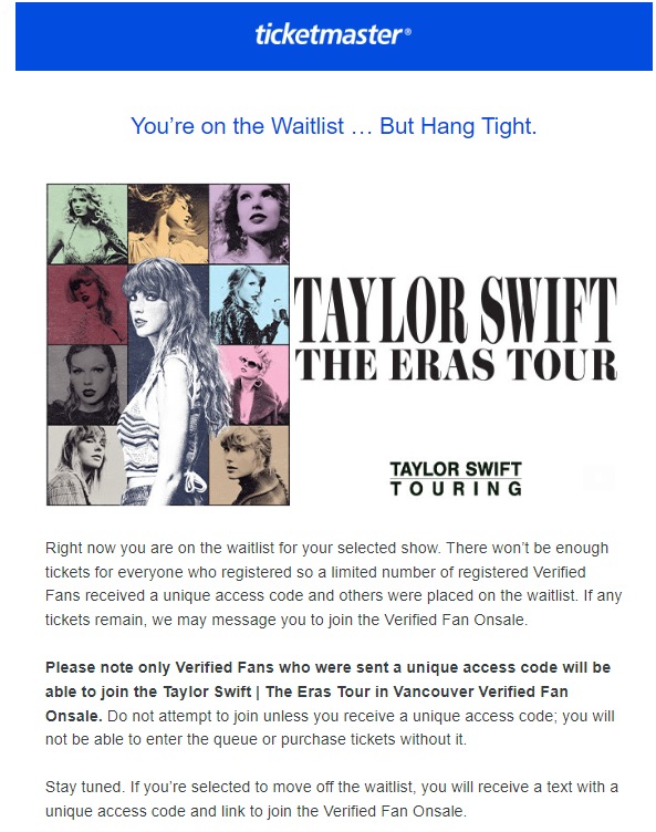 据估计,泰勒·斯威夫特在多伦多的六场演出会的门票,约有 3000 万人注册购买。