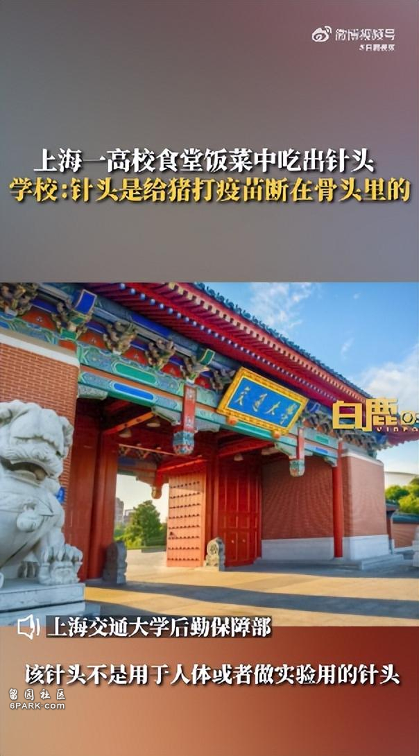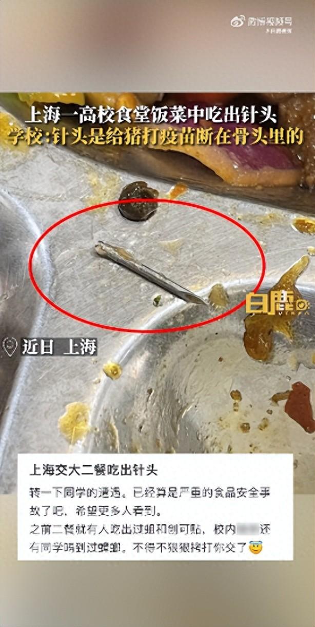 11月24日,據陝西網“白鹿視頻”報道,近日,在上海,有網友發帖稱高校學生在餐廳飯中吃出針頭,學校給當事同學解釋是給豬打疫苗的針斷進去了。