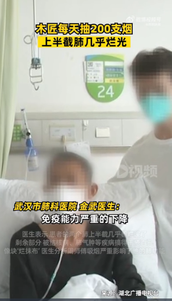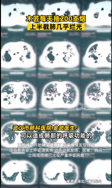 中國湖北省崇陽縣壹名周姓木匠,因為經常要加班工作到深夜,於是借由抽煙提神而染上煙癮,20年來幾乎醒著的時候就煙不離手,平均壹天要抽200根煙,如今出現嚴重呼吸困難等症狀,就醫檢查發現,他半個肺已經爛光了,剩下的也像“爛抹布”般千瘡百孔。