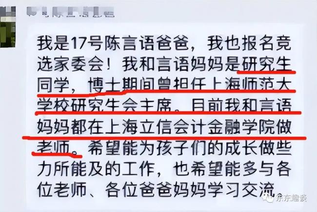 還有很多家長來自高知家庭;有金融高管,國外名校留學生,國內985大學畢業生的。看他們的介紹,都是有壹定社會地位的人;為了孩子的教育也在競選家委會的職務。