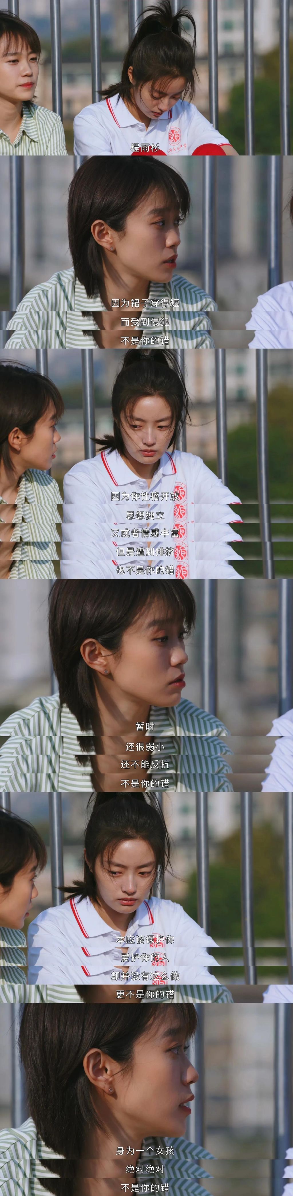 在《鳴龍少年》這部作品中,有壹段黃堯在天台的發言深深地觸動了我。他說:“因為裙子穿得短而受到侵犯,不是你的錯。因為你性格開放、思想獨立,又或者情感豐富但是遭到排擠,也不是你的錯。暫時還很弱小,還不能反抗,不是你的錯。本應該保護你、愛護你的人,卻並沒有這麼做,更不是你的錯。身為壹個女孩,絕對絕對不是你的錯。”#鳴龍少年##張若昀#