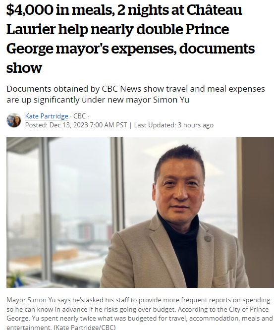 文件顯示,BC省喬治王子市市長上任不到壹年,在餐飲、娛樂、旅行和住宿方面的預算大幅超支。