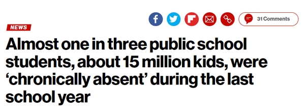 根據Attendance Works發布的壹項研究,從加州(专题)到紐約州,66%的公立學校學生去年就讀的學校存在嚴重或極嚴重的長期曠課現象,而長期曠課的定義是壹學年至少缺勤10%。這相當於至少有18天缺課,許多人將其歸咎於新冠大流行後難以適應面對面學習。
