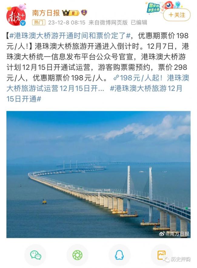 近日,港珠澳大橋准備開通旅游了,在12月15日試運營。票價298元/人,現在優惠期票價198元。