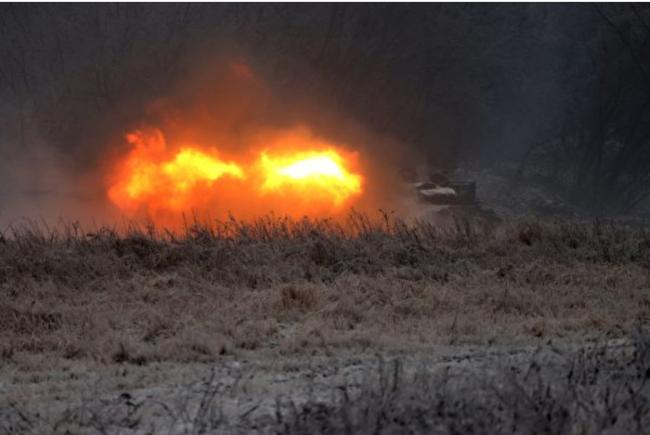 2023年12月15日,一辆乌克兰坦克在东部顿涅斯克地区前线附近举行的演习中开火。(Anatolii Stepanov/AFP via Getty Images)