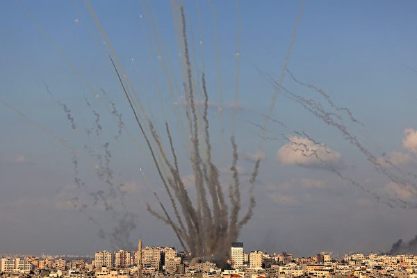 2023年10月10日,哈马斯从加沙地带向以色列发射火箭。(Mahmud Hams/AFP via Getty Images)