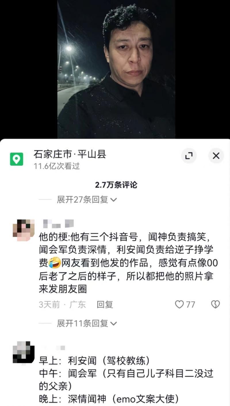 有網友總結,這3個賬號就像叁個獨立的人格,早上,他是“帶九個學員,過了八個,自己兒子沒過”的駕校教練;中午,他是跳著土味舞蹈的“聞神”;晚上,他是發著emo文案配自拍的深情聞會軍。