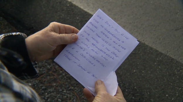本周早些時候,謝麗爾在自家郵箱發現壹封來自匿名斯克魯奇的措辭簡潔的便條,批評她的聖誕燈飾。
