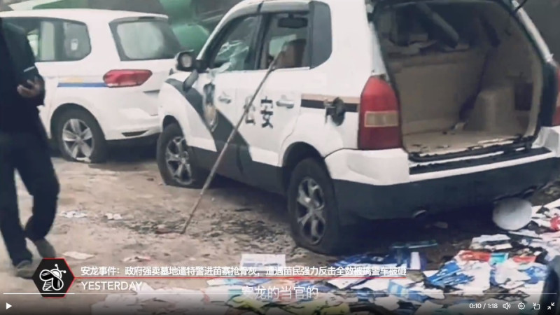 在貴州省安龍縣石灰窯村冬瓜嶺,當地公安的警車被苗族村民砸壞。 圖:擷取自昨天X帳號公布影片