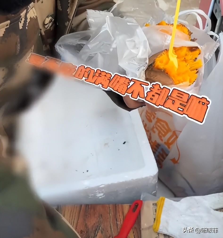 都說南方姑娘吃東西斯文,東北大哥直接把烤好的番薯掰成兩半,還贈送勺子,要南方小土豆優雅品嘗。這是壹個什麼樣子的待遇,感覺男朋友都不會這麼操作,雖然是寒冷的天,但是心裡真的好溫暖!