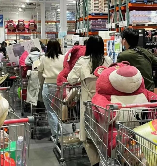 其中,最受歡迎的要數“頂流“草莓熊。作為爆紅的卡通人物之壹,草莓熊為開市客吸引了不少人流,大批年輕人排隊拍照打卡,開業不到20分鍾,399元的中號草莓熊就被搶光;1999元、身高壹米八的大號草莓熊也在兩小時內全部售罄。