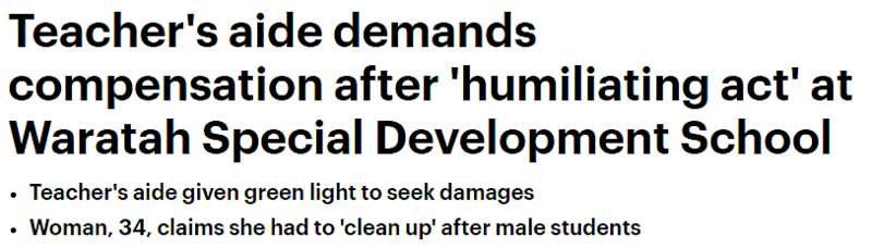 《每日邮报》1月14日报道称,因被迫在男学生手淫后进行“清理”,一所特殊教育学校的一名助教向维州政府要求赔偿。