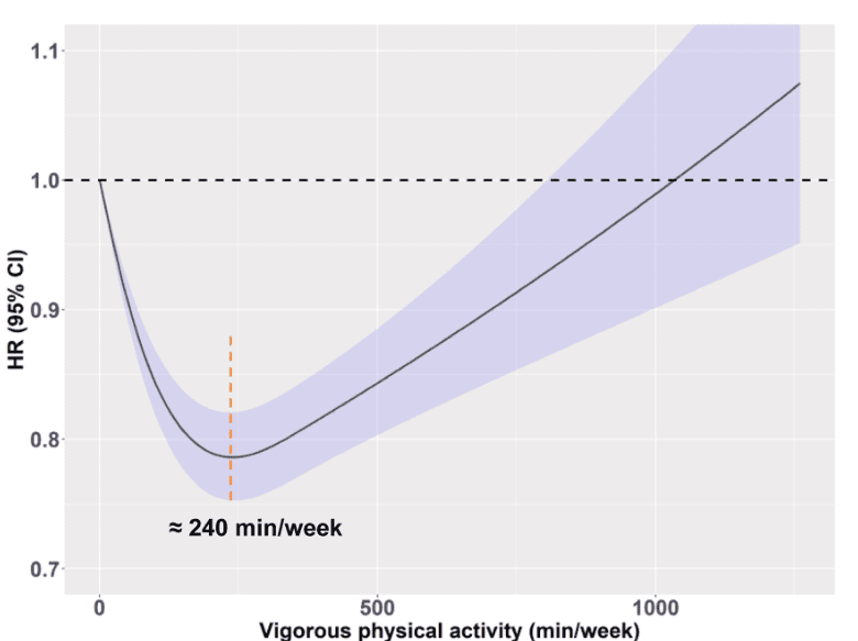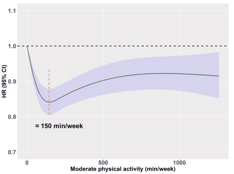 中度體力活動中,死亡風險在150分鍾/周左右達到最低點