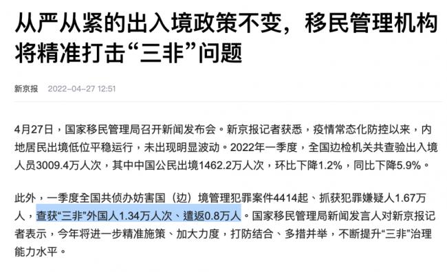 叁是疫情期間中國實施“外·防·輸·入、內·防·反·彈”的防·疫政策,就連正常入境的外籍人士也要經過層層衛生檢測才能入境中國,非法入境更成為不可能。僅僅2022年第壹季度,中國邊檢就查獲“叁非”外國人1.34萬人次、遣返0.8萬人。