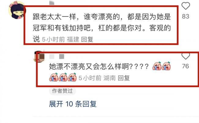更有一位网友表示:跟老太太一样,谁夸漂亮的,都是因为她是冠军和有钱加持吧,杠的都是你对,客观说。
