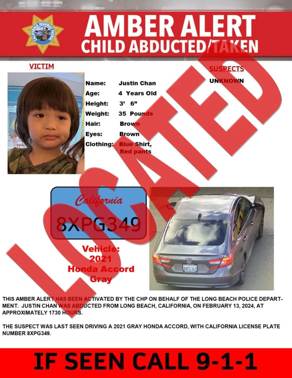 根据安珀警报显示,失踪的孩子是4岁的贾斯汀·陈(Justin Chan),失踪地点在长滩市(Long Beach),嫌犯驾驶一辆2021年的灰色本田雅阁逃跑。如果有民众发现,请立即拨打911报警。