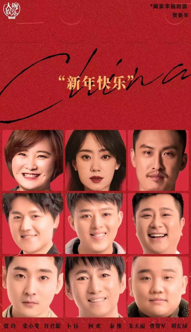 大碗娱乐有9位艺人亮相新春贺卡,分别是贾玲,张小斐、许君聪、卜钰、何欢、秦维、朱天福、曹贺军、刘宏禄等。
