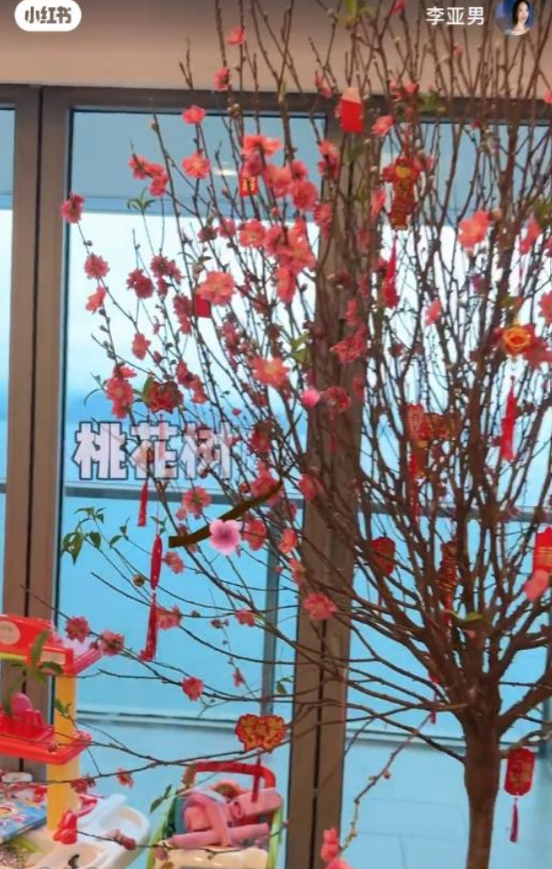 李亚男在影片中介绍贺年布置,空间阔落的客厅摆放一棵大桃花,玄关位置则有一盆大吉及兰花。 客厅中见到女儿的玩具,而大门的双开设计,不但有气派,更可从门口旁的楼梯直上天台,私隐度非常高。