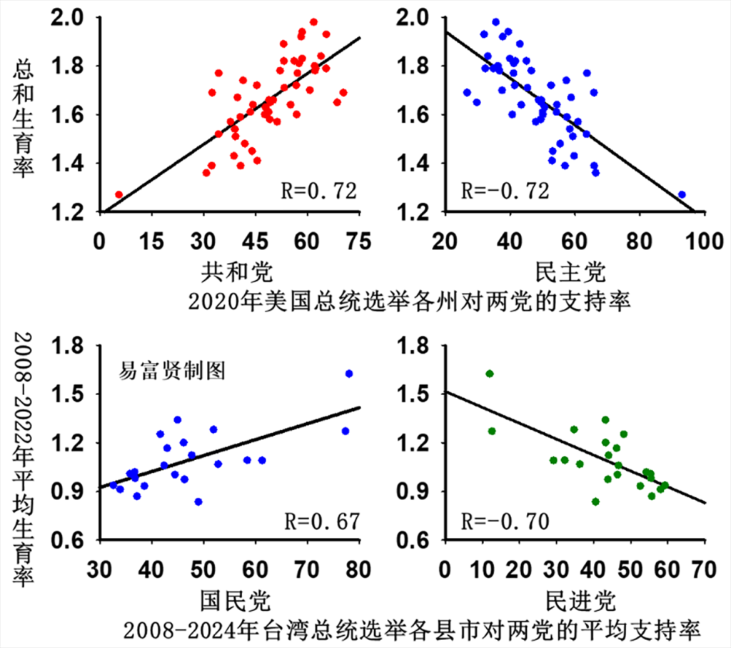 台灣叁黨都屬於自由派,尤其是民進黨理念中的“非婚非育”色彩比歐美自由派政黨更濃。台灣2008-2024年伍次總統選舉,各縣市對民進黨的平均支持率與生育率直線負相關,而對國民黨的支持率則相反。撇開地緣政治,民進黨的理念與美國民主黨的更接近,而國民黨則與共和黨的更接近。