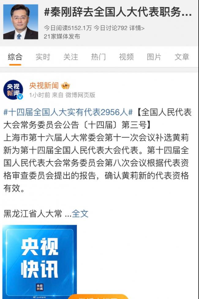 根據《新華社》今(27)日的報道,公告顯示,有 5 位第拾肆屆全國人民代表大會代表遭到罷免,還有 4 位辭去職務。辭去全國人大代表職務的人中,就包含了秦剛。