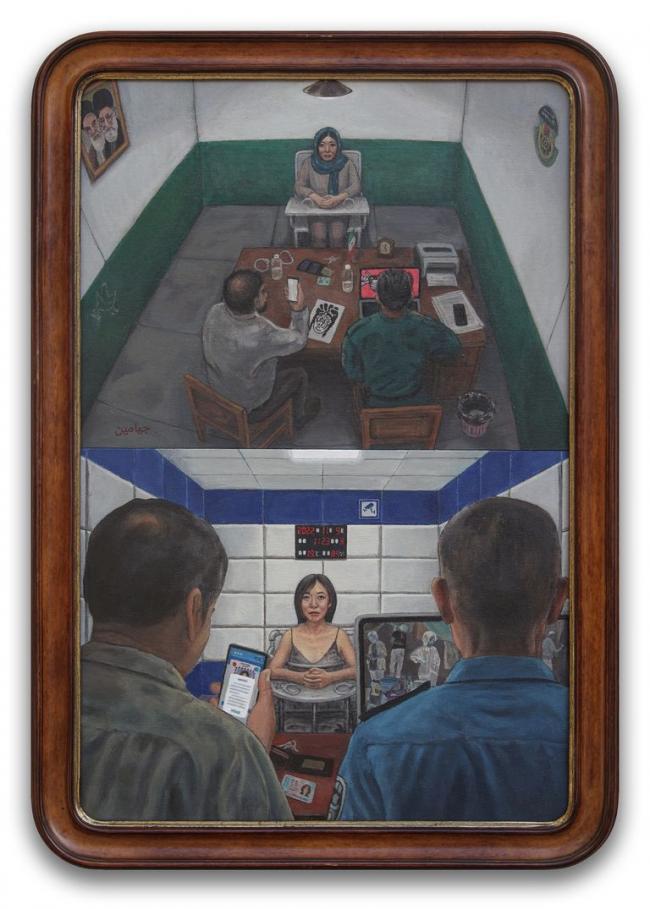 旅法中国艺术家胡嘉岷根据德黑兰狱中来信描述的审讯过程和与笔者真实身份相关的类似场景创作的画作。图片来源:COURTESY OF HU JIAMIN
