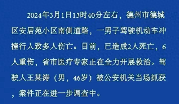 實在令人痛心!3月1日,山東德城區發生了壹起交通事故,壹名男子不知道是受了什麼刺激,竟開著汽車直接撞向了附近的學生人群,造成2死6重傷的悲劇。
