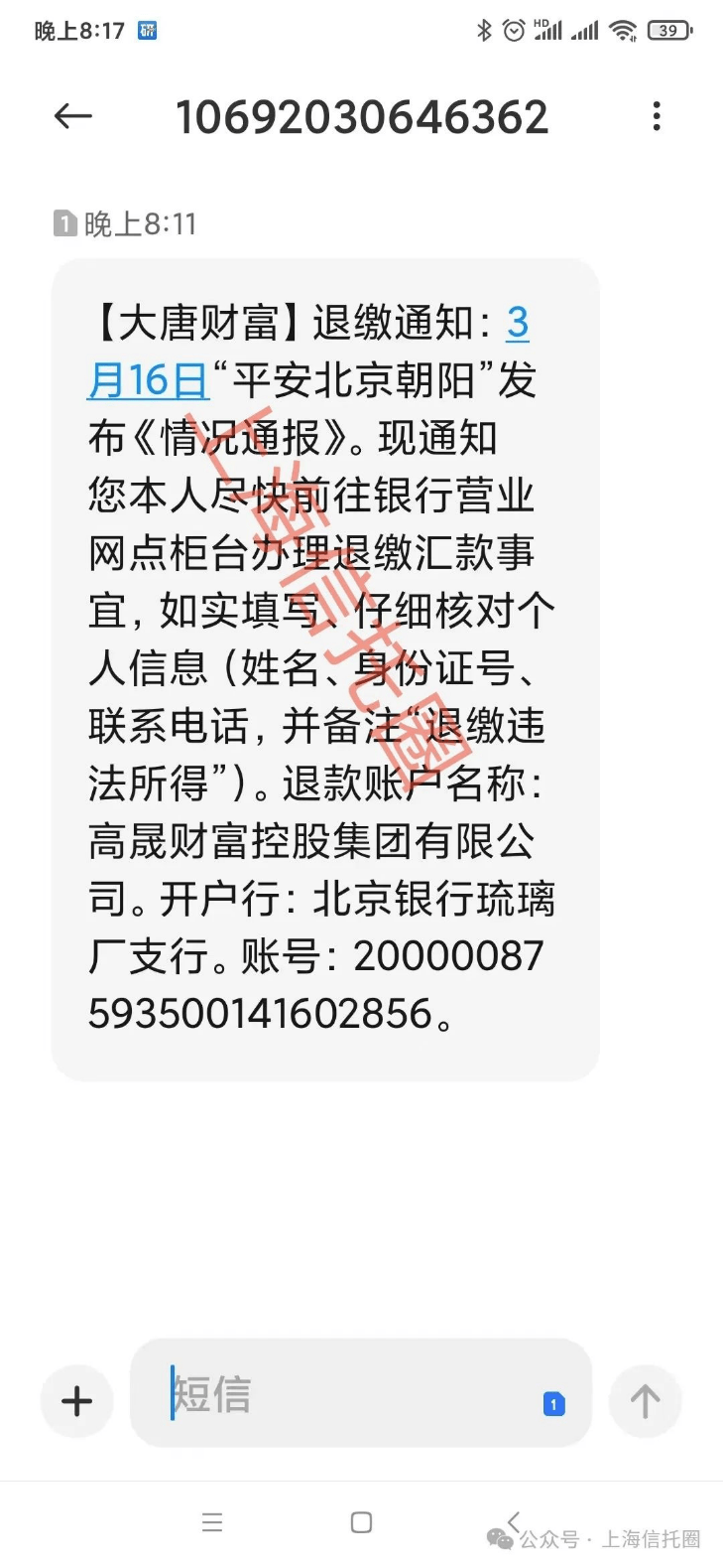 通报发出后,涉案的恒天财富、新湖财富、高晟财富、大唐财富等公司的员工,陆续收到退缴违法所得的通知短信。