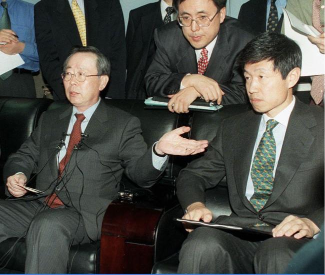 資料圖:1998年12月31日,韓國政府與新橋簽署《共識備忘錄》後召開新聞發布會,左:韓國金監會主席李憲宰,右:單偉建。圖源:《金錢博弈》