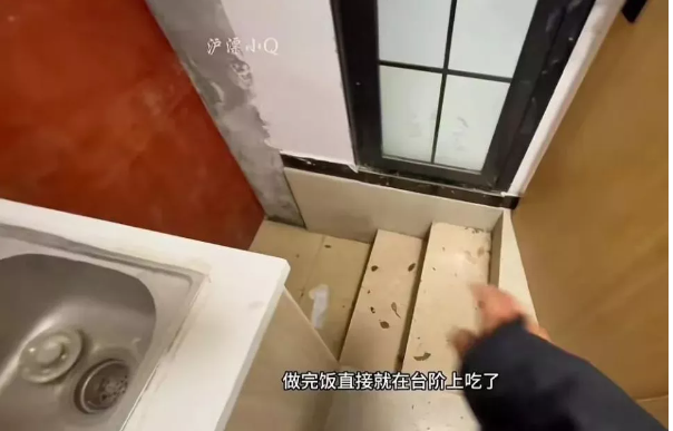 視頻裡,男子稱其為“小復式”。是壹套壹室壹廳,壹廚壹衛的房子。進門左邊就是壹個小廚房,中間是壹個下沉式的小客廳。做完飯就直接在台階這裡吃了。