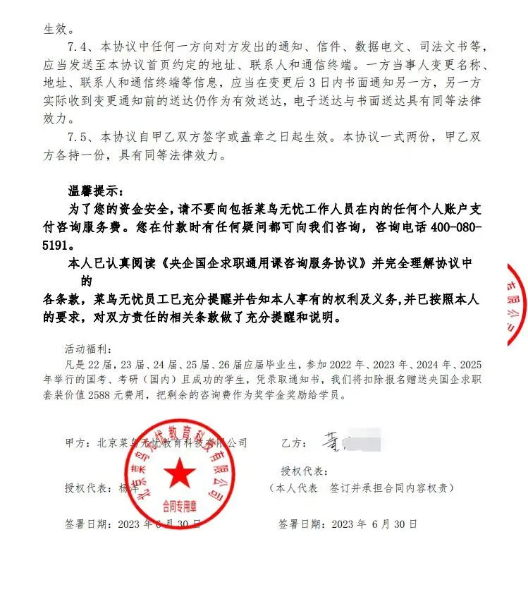 董绮是一名法学硕士研究生,今年面临毕业找工作。她报名参加了线上的求职培训。这家培训公司是北京菜鸟无忧教育科技有限公司(以下简称“菜鸟无忧公司”)。