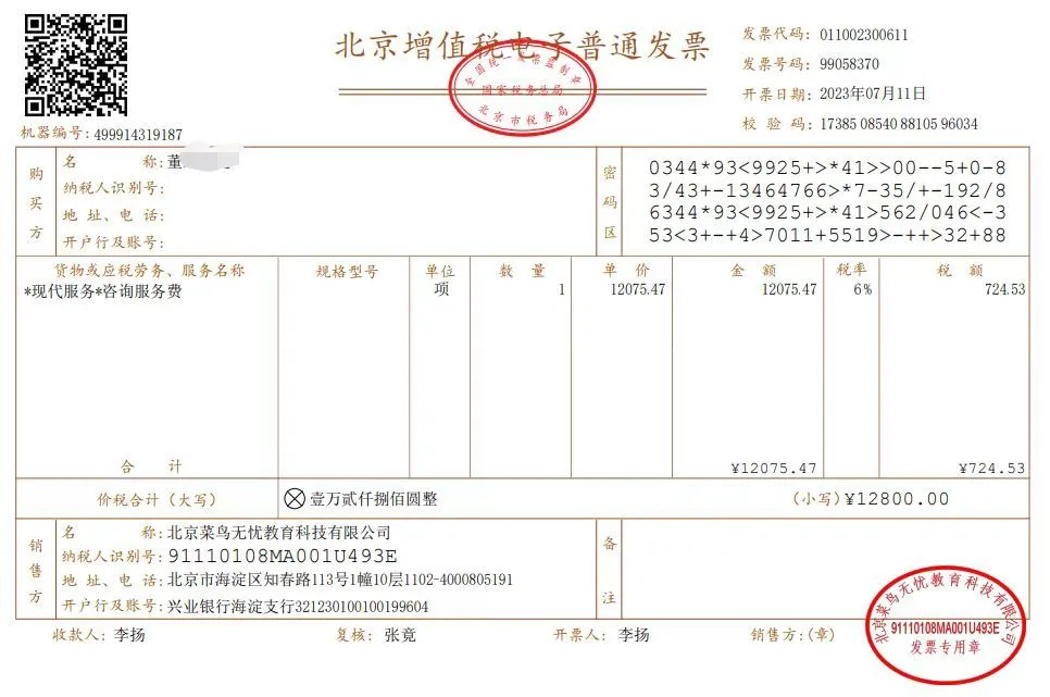 2023年6月30日,董绮交费12800元,报名参加了菜鸟无忧公司的央企国企求职培训“基础班”,双方签订了协议。协议上盖有菜鸟无忧公司的印章,该公司的授权代表为杨洋。根据协议,菜鸟无忧公司提供《央企国企求职通用全流程经典版》课程服务,包括视频课程、人企匹配服务等。
