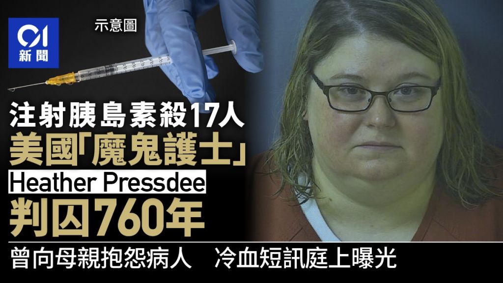 美國41歲女護士普萊斯迪(Heather Pressdee,暫譯)涉嫌使用胰島素殺害療養院病人,她本來被控殺害2人,但據檢方11月2日指,她最新承認曾試圖殺害另外19人,檢方稱,在她“照顧”下死亡的病人多達17人。檢察官指她向22名病人注射胰島素,當中部份人並無糖尿病。